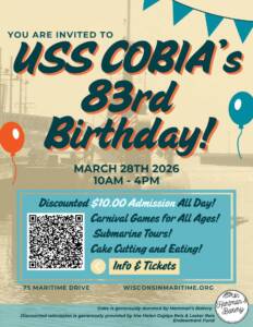 Join us on Saturday, March 28th, as we celebrate 83 years of USS Cobia. This annual “birthday party” is a community event, offering a full day of family-friendly fun, history, and maritime tradition.